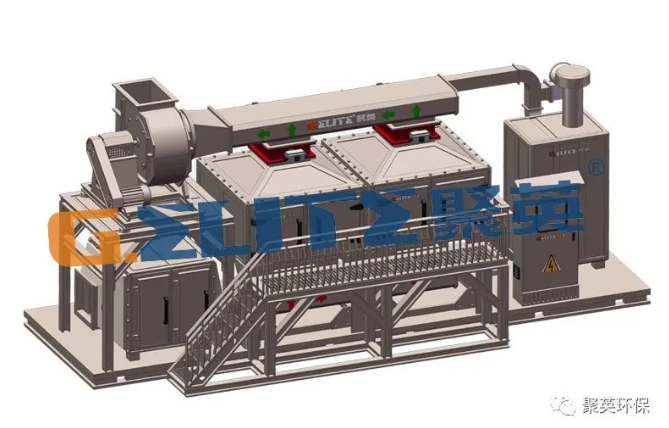 由環(huán)保離心風(fēng)機將大風(fēng)量、低濃度有機廢氣吸入沸石吸附床,在吸附床內(nèi)與多層蜂窩狀沸石充分凈化(吸附),沸石內(nèi)部逐漸富集濃縮大量有機廢物,而潔凈的氣體則排入大氣;通過燃燒裝置產(chǎn)生的高溫氣體經(jīng)換熱之后通入活性炭吸附床,使內(nèi)部有機廢物300-500℃高溫氣化從活性炭孔隙中逸散而出,此時的廢氣濃度遠遠高于初始吸附的廢氣濃度,然后進入催化燃燒裝置(350℃)進行氧化分解成CO 和H O等無害氣體,氣體經(jīng)由熱交換器將熱量傳遞再次用于脫附,排入大氣,以此完成一整套凈化流程。