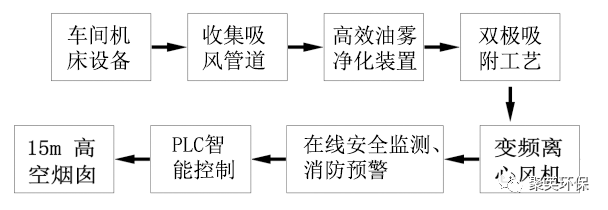 收集系統(tǒng) →高效油霧凈化裝置 → 雙極吸附工藝 → 風(fēng)機(jī)→在線安全監(jiān)測、消防預(yù)警 →PLC智能控制→ 煙囪(室外寶塔煙囪)