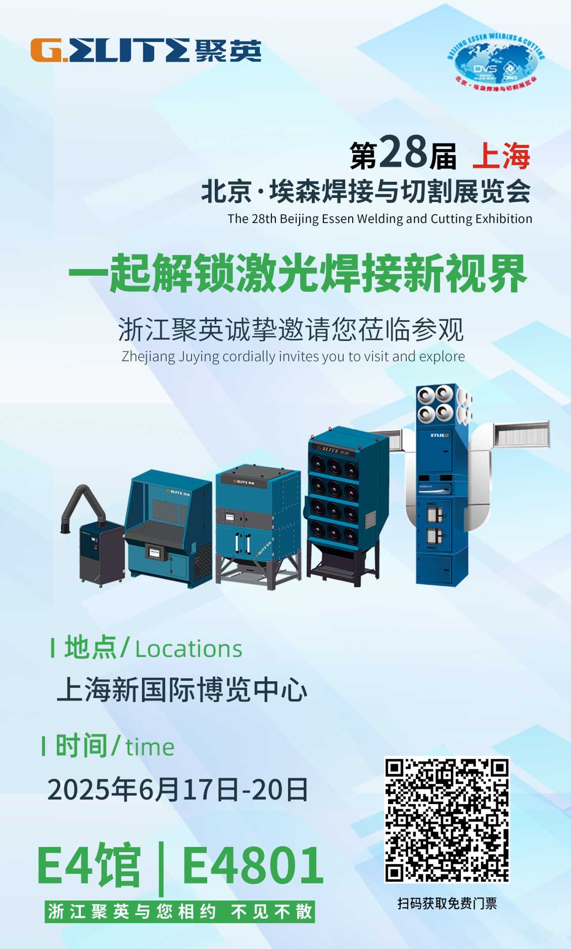 親愛的朋友們,焊接與切割行業的年度盛宴 —— 第 28 屆北京?埃森焊接與切割展覽會,即將于 2025 年 6 月 17 - 20 日在上海新國際博覽中心盛大開啟!浙江聚英已連續多屆參與此盛會,今年將在E4號館E4801展位為您呈現行業前沿顛覆性創新智能焊接解決方案,期待您的蒞臨!